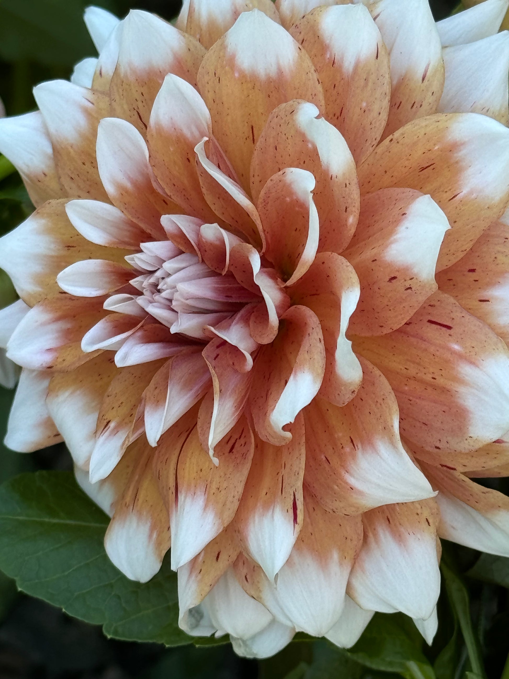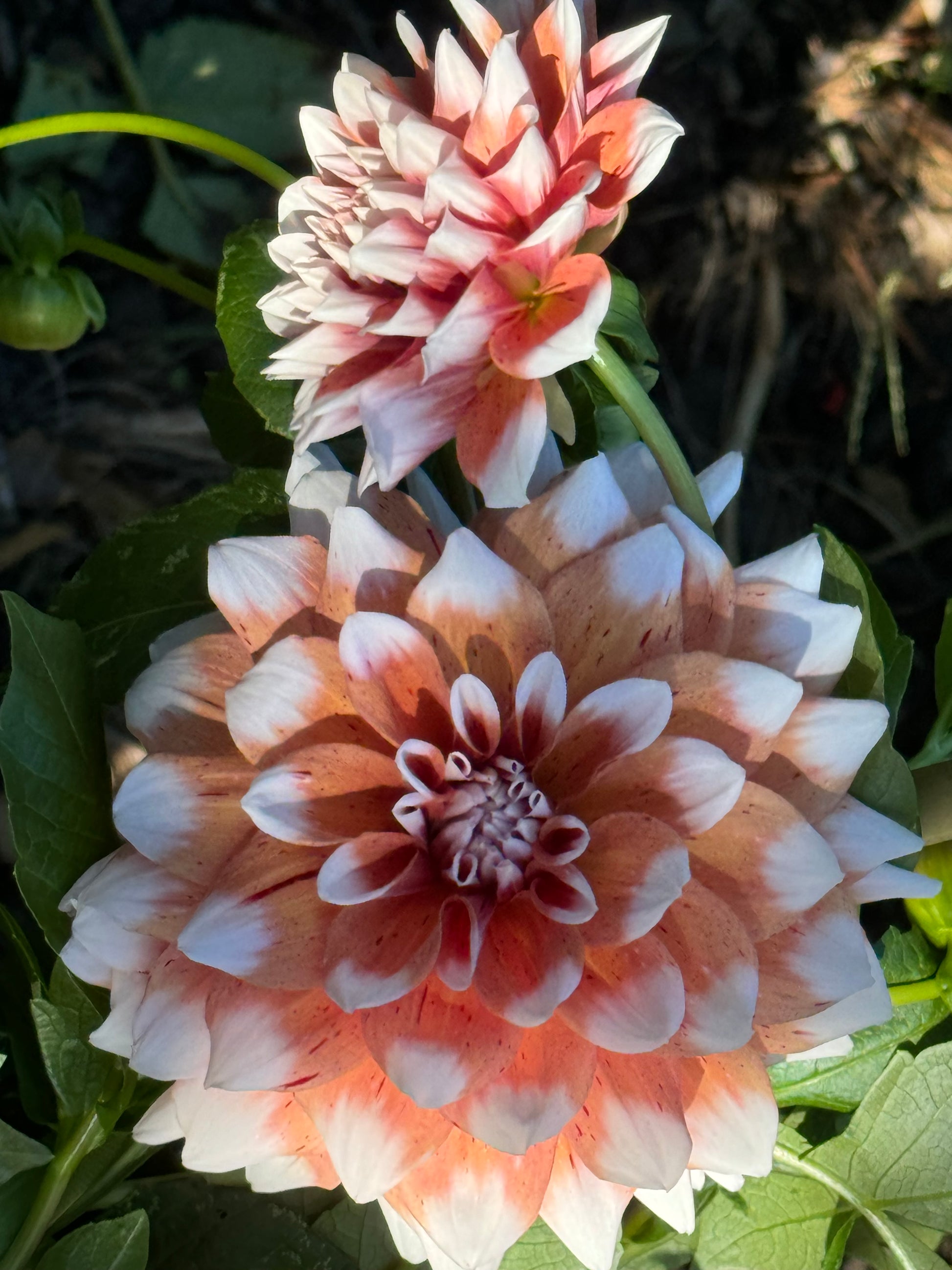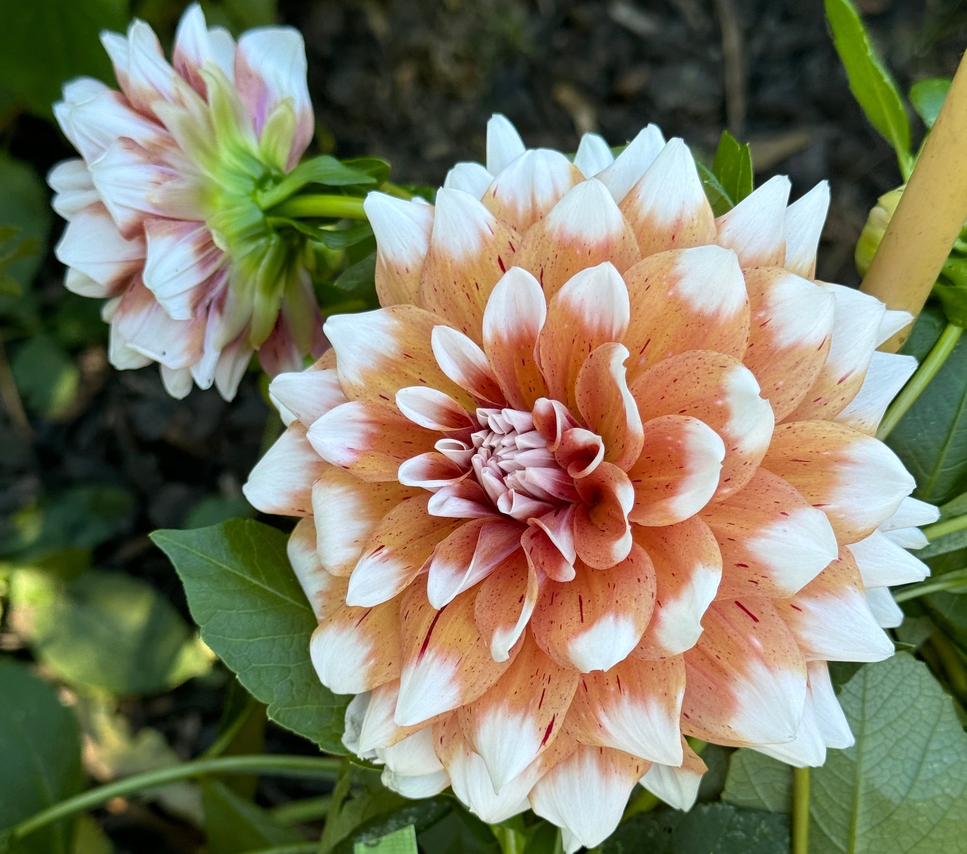 Dahlia with 6” peach white blooms. 4’ tall. ID.